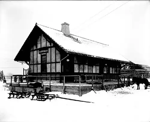 ![]() New Harriman station depot, seen in 1911 in a photograph by James E. Bailey, the Erie's official photographer and dispatcher from Meadville, Pennsylvania. | |||||||||||||||||||||