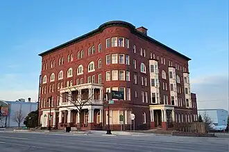 The Harrington Hotel is a five-story, red brick building located on a corner lot. The design contains elements of Richardsonian Romanesque style, such as a tri-part facade and deeply set round arched windows, and elements of Classical Revival style, such as detailed wooden porches and panel friezes. The two main facades have a symmetrical window positioning, with a single story base section containing large round arched windows in the Military Street facade and smaller windows, placed in groups of three, in the Wall Street facade. The second and third stories contain double-hung windows, and the fourth floor section has large round arched openings each containing a door flanked by windows. The fifth floor section contains small, round arched windows in pairs.[2]
