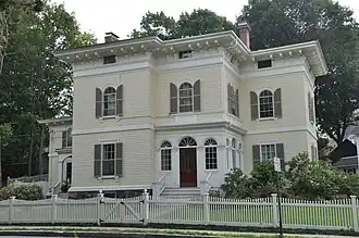The Harrison Parker Sr. House is a historic house in Winchester, Massachusetts. The 2+1⁄2-story wood-frame house was built in 1843 by Harrison Parker Sr., the owner of a local lumber mill. It is also one of the finer examples of Italianate style in the town, with a low-pitch hip roof with wide eaves decorated with brackets, and small attic windows set in the architrave. The second story windows have round-arch tops, and there are decorated porches on three sides. The interior includes well-preserved period details.[2]