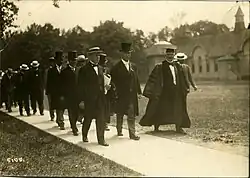 Commencement, 1912: University President H.B. Hutchins and dignitaries walking across The Diag toward the Engineering Arch