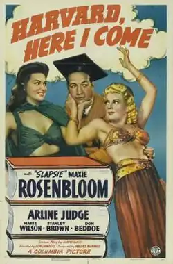 Harvard, Here I Come! is a 1941 American comedy film directed by Lew Landers and stars Max 'Slapsie Maxie' Rosenbloom, Arline Judge, Stanley Brown, Don Beddoe, Marie Wilson, and Virginia Sale.[1] The film is also known as Here I Come in the United Kingdom.