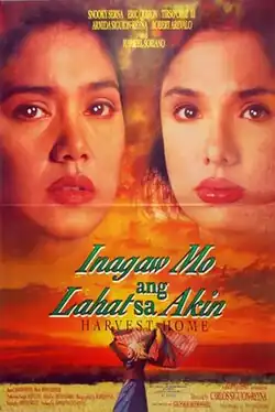 Harvest Home (Filipino: Inagaw Mo Ang Lahat Sa Akin / transl. You Stole Everything from Me) is a 1995 Philippine melodrama film directed by Carlos Siguion-Reyna from a story he co-wrote with Oscar Miranda and Bibeth Orteza, who solely wrote the screenplay. The film stars Maricel Soriano and Snooky Serna as sisters reunited after the death of their father, with Armida Siguion-Reyna (who also served as the producer), Eric Quizon, Tirso Cruz III, and Robert Arevalo in supporting roles.