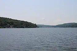 Harveys Lake (also known as Harvey Lake or Harvey's Lake[1]) is a natural lake in Luzerne County, Pennsylvania. It has a surface area of approximately 621.5 acres (251.5 ha), or nearly a square mile. The lake is situated entirely within the borough of Harveys Lake.[2][3] By volume, it is the largest natural lake in Pennsylvania, and by surface area, is the second-largest lake. It is a glacial lake surrounded by hills and is the source of Harveys Creek, a tributary of the Susquehanna River. The lake has a stone masonry dam. The lake's watershed has an area of approximately 3600 acres. The majority of the watershed is forested, but there is some developed land as well. Nearly all of the developed land is close to the lake itself, and the lake is surrounded entirely by a paved road.