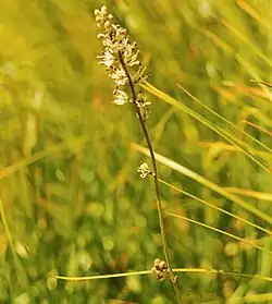 This is a perennial herb growing from a black bulb 2 to 4 centimeters long and producing an erect flower stem up to 50 centimeters tall. A number of long, bending leaves surround the stem at its base, and the rest of the stem is naked. The top portion of the stem is a narrow, pointed inflorescence of many white or greenish lilylike flowers. Each small flower has six curled perianth parts and six protruding stamens with very large anthers. The flowers fall away to leave the developing fruits, which are capsules a few millimeters wide containing black seeds.