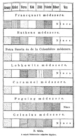 Out of these systems, Otto Titan von Hefner published some further hatching methods at table X of his above cited book, presenting hatching methods for some additional tinctures as well. Some additional tinctures had already appeared in the theory of heraldry in the early 15th century, which were then soon applied in practice. The German jurist and heraldist Eucharius Gottlieb Rink (1670–1746) introduced hatching for the gray (Eisen = iron) and proper (Naturfarbe). These hatchings (natürlichen Farbe, Eisenfarbe) were presented by Gatterer as well. He maintained that the first one is needless, but the second one has its own importance, because he had noticed himself that old armorials produced by heralds, at least in Germany, also made a difference between iron-colour (Eisenfarbe) and the white colour (weisse Farbe), when they omit the term Argent. He also recommended to study the work by Johann David Köhler titled Programma de auctoribus incisurarum, to learn about the origin of hatchings.[4] The German heraldist Christian Samuel Theodor Bernd (1775–1854) introduced hatching for some other tinctures such as Umbra (sienne, earth-color), Rotgelb (yellow-red, orange), Stahlblau (steel blue) and Blutfarbe (sanguine).
