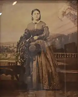 While in France, Hill exhibited in two Paris Salons. After returning to the United States, she maintained a portrait studio in Los Angeles from 1895 to 1898.[5] Back at her home in Bourbon County, Kentucky Hill became a prolific painter and china-painting teacher. She was a close friend of Sarah Bernhardt, of whom she painted a portrait.[6] She painted a portrait series of Bourbon County judges which hangs in the Bourbon County Courthouse. Hill lived, painted, and taught in Paris, Kentucky until her death in 1921.[7]