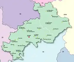 Hautes-Alpes (French pronunciation: [ot.z‿alp] ; ⓘOccitan: Auts Aups; English: Upper Alps) is a department in the Provence-Alpes-Côte d'Azur region of Southeastern France. It is located in the heart of the French Alps, after which it is named. Hautes-Alpes had a population of 141,220 as of 2019,[3] which makes it the third least populated French department. Its prefecture is Gap; its sole subprefecture is Briançon. Its INSEE and postal code is 05.