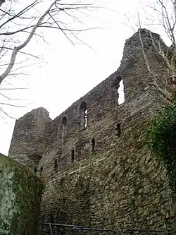 The original entrance to the castle lay on the west side, guarded by a gatehouse; but no trace of this survives. There are round towers at the north-west and south-west corners, and at the south-east corner there is a square tower with an additional projecting turret. The south-west and south-east towers have three storeys, with the south-east tower possessing a basement and postern gate which could be used in a counter-attack during a siege.[5] A large hall lies in the south of the castle with great, high windows and scaling ladders. Little remains of the original medieval defences in the outer ward of the castle, although the extensive curtain wall has been maintained and still remains, along with a considerable part of the north side, including a semicircular turret and a square tower to the east.[5]
