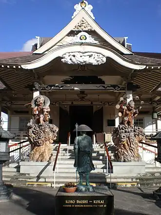 The round tomoe at the top of the entrance roof represents the cycle of life. It is also the traditional symbol of the Koyasan Shingon sect, though the temple has been independent of sectarian affiliations since 2004. The carved phoenix represents death and rebirth, and the carved dragons represent both power and good fortune. The obelisk at the front edge of the property commemorates the first Shingon pilgrimage to Japan by immigrants in Hawaii in 1929. The more recently added statue in front depicts Kōbō Daishi (Kūkai, 774-835 CE), the founder of Shingon.[2] An oil painting of the Daishi by a member, Mrs. Helen Nakagawa Abe, of the local congregation also graces the altar inside the temple.[3] The temple is congregational, and reflects the diversity of Hawaii in its membership.