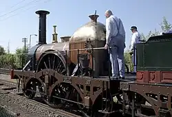 A haycock boiler is an early form of steam locomotive boiler with a prominently raised firebox of "Gothic arch", "haystack", or "coppernob" shape. The term haystack is most commonly used, but is avoided here as it is confusingly used for three quite different forms of boiler.[1] This particularly large outer firebox served as the steam dome and was often highly decorated with polished brass. These were popular for early railway locomotives, from 1840 to the 1850s.[2]