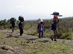 It is also wide-spread in Africa. Women in particular may have practical reasons for carrying on the head. For many African women it is "well-suited to the rough, rural terrain and the particular objects they carry—like buckets of water and bundles of firewood". The practice is usually not abandoned after migrating to urban areas where their daily routines, and socially accepted practices, are different. In Ghana, affluent residents of the southern cities employ young women who migrate from the poorer northern region to work as "head porters", called kayayei, for $2 a day.[3] In East Africa, Luo women may carry loads of up to 70% of their own body weight balanced on top of their heads. Women of the Kikuyu tribe carry similar heavy loads, but using a leather strap wrapped around their forehead and the load to secure it while it is carried . This results in a permanent groove in the forehead of the women. However, there is no evidence of other harmful effects on the health of women who carry heavy loads on top of their heads. Researchers speculate that training from a young age may explain this. Up to 20% of the person's body weight can be carried with no extra exertion of energy.[4] Other researchers have shown that African and European women carrying 70% of their body weight in controlled studies used more oxygen while head-carrying, in contrast to carrying a load on their backs. The research did not support the notion that head-loading is less exerting than carrying on the back, "although there is some evidence of energy saving mechanisms for back-loading at low speed/load combinations".[5]