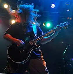 Stoner rock or stoner metal is typically slow-to-mid tempo, low-tuned, and bass-heavy.[106] It combines elements of psychedelic rock, blues rock and doom metal, often with melodic vocals and 'retro' production.[107] The genre emerged during the early 1990s, and was pioneered foremost by the Californian bands Kyuss[108] and Sleep.[109] Other prominent stoner metal bands include Acid King and Electric Wizard.