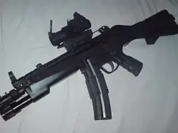 The Heckler & Koch MP5 (German: Maschinenpistole 5, lit. 'Submachine gun 5') is a submachine gun developed in the 1960s by German firearms manufacturer Heckler & Koch. It uses a similar modular design to the Heckler & Koch G3, and has over 100 variants and clones,[14] including selective fire, semi-automatic, suppressed, compact, and even marksman variants.[15] The MP5 is one of the most widely used submachine guns in the world, having been adopted by over forty nations and numerous militaries, police forces, intelligence agencies, security organizations, paramilitaries, and non-state actors.[16][17]