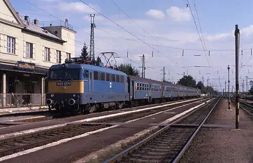Hegyeshalom (Hungarian: Hegyeshalom vasútállomás) is a railway station in Hegyeshalom, Győr-Moson-Sopron County, Hungary. Opened on 24 December 1855,[1] it is an important border station between Austria and Hungary. The station is located on the main line between Vienna and Budapest (Line 1 Budapest–Hegyeshalom railway and the Ostbahn) and also Line 16 Hegyeshalom–Szombathely railway and Line 132 Bratislava–Hegyeshalom railway. The train services are operated by MÁV START.