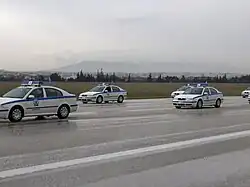 The Hellenic Police (Greek: Ελληνική Αστυνομία, Ellinikí Astynomía, abbreviated ΕΛ.ΑΣ.) is the national police service and one of the three security forces of Greece (the others being the Hellenic Fire Service and the Hellenic Coast Guard). It is a large agency with responsibilities ranging from road traffic control to counter-terrorism. Police Lieutenant General Dimitrios Mallios[1] is Chief of the Hellenic Police. He replaced Lazaros Mavropoulos in January 2024. The Hellenic Police force was established in 1984 under Law 1481/1-10-1984 (Government Gazette 152/A/8-10-1984) as the result of the fusion of the Gendarmerie (Χωροφυλακή, Chorofylakí, 1833–1984) and the Cities Police (Αστυνομία Πόλεων, Astynomía Póleon, 1921–1984) forces.[2]