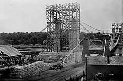 As a result of the charter, the Mississippi Bridge Company was formed and selected engineer Thomas W. Griffith to lead the construction of a bridge in place of the rope ferry system.[1] Work began on a suspension bridge on May 5, 1854.[1][3] The bridge cost $36,000 ($1.21 million in 2024) to build.[4] The span of the bridge was 620 feet, and the cables dropped 47 feet from their towers.[2] The design was "of a modern character" and compared to the Niagara Falls Suspension Bridge.[5]