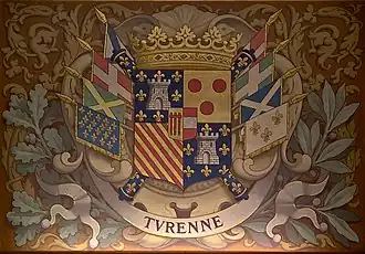 Shield | Français : Blason : écartelé, en 1 et 4 d'azur semé de fleurs de lys d'or et à la tour d'argent maçonnée et ouverte de sable (qui est de La Tour), en 2 d'or au trois tourteaux de gueules (qui est Boulogne), et 3 coticé d'or et de gueules de 8 pièces (qui est Turenne), sur le tout parti d'or au gonfanon de gueules frangé de sinople (qui est Auvergne) et de gueules à la fasce d'argent (qui est Bouillon) |