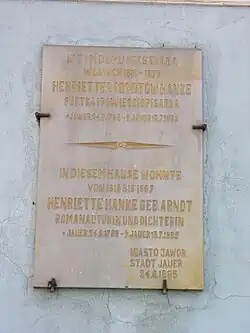 Memorial plaque for Henriette Hanke on her house in Jawor | |