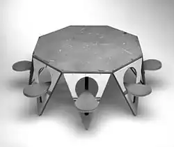 Concepts: Efficiency in materials use, minimize waste in manufacturing, reduce environmental impact. Optimize shipping, portability & storage of furnishings by use of folding and collapsing design elements.[6] This earned him the name "Folding Glass" in the industrial design community.