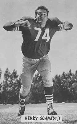 Schmidt played collegiately at the University of Southern California and professionally between 1959 and 1966, starting with the National Football League's San Francisco 49ers and moving to the new American Football League's San Diego Chargers in 1961. He played on the Buffalo Bills 1965 AFL Champions in 1965, earning a place in that year's AFL All-Star Team. He finished his professional football career in 1966 with the AFL's New York Jets.