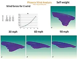 The netting is 38 ft off the ground and 100 ft. tall and the three support poles are 102 ft, 125 ft. and 145 ft. tall.[4] The netting is designed to show the movements of the wind. Its shape reflects Arizona's enormous cumulus clouds. At night, the colors gradually change with the seasons adding cool hues in the summer and warm hues in the winter.[5]