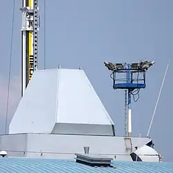 The French FREMM frigate Alsace exiting Port-Louis harbour. The Herakles antenna is the rotating pyramid on top of the superstructure above the bridge