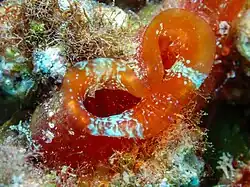 This solitary ascidian is sometimes referred to as the red-throated ascidian, as its two siphons are a vivid red in colour. However, most solitary ascidians that are encountered are so covered in algae that the coloration is often not visible. When found at depth the red colourations may also not be visible, as lower frequencies of light are absorbed by the layers of water above.