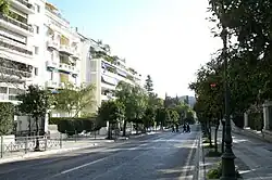 The tree-lined one-way street runs from north (Vasilissis Sofias Avenue) to south (Vasileos Konstantinou Avenue) connecting the districts of Kolonaki and Pangrati. It is, by far, the most expensive piece of housing real estate in Greece and one of the most expensive in Europe.[1] The five-block-long eastern side of the street is lined with luxurious apartments and mansions, foremost among them the Presidential Palace, the official workplace and residence of the president of the Hellenic Republic, and the Maximos Mansion (Μέγαρο Μαξίμου, Megaro Maximou), the official workplace of the prime minister. Kolonaki, a shopping district, lies immediately to the north, and Pangrati, a residential district, to the south, the National Gardens to the west and the Panathenaic Stadium to the southeast. The barracks of the Presidential Guard are the only buildings on the western (National Garden) side of the street. The street is heavily guarded by police (both uniformed and plainclothes) round the clock.