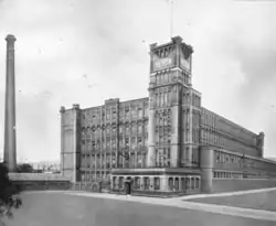 In the second half of the 19th century Oldham became a world centre for spinning cotton yarn.[6] This was due in a large part to the formation of limited liability companies known as Oldham Limiteds. In 1851, over 30% of Oldham's population were employed in the textile sector, compared to 5% across Great Britain.[7] At its zenith it was the most productive cotton spinning mill town in the world.[8][9] By 1871 Oldham had more spindles than any country in the world except the United States, and in 1909, was spinning more cotton than France and Germany combined.[10] By 1911 there were 16.4 million spindles in Oldham, compared with a total of 58 million in the United Kingdom and 143.5 million in the world; in 1928, with the construction of the UK's largest textile factory Oldham reached its manufacturing zenith.[6] At its peak, there were over 360 mills, operating night and day.[11][12]