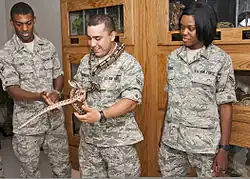 A U.S. Air Force Airman handles a snake to overcome herpetophobia. | |