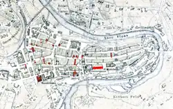 Herrengasse, like most streets in the Old City, runs east to west. However due to the increasing width of the Aare peninsula the street only runs a short distance from the Münsterplatz (the plaza in front of the Münster of Bern) to the Casinoplatz. The Herrengasse is divided into 2 sections along the center of the street. The Sonnseite (Sunny Side) was originally the southern flank of the 1191 Zähringerstadt. The Schattseite (Shady Side) was built later as the original city expanded within the city walls from 1191.[2] In addition to the division along the street, there is also a division in the middle of the street. Along both sides of the street there are two separate rows of buildings, with a small passageway between them which runs north and south. South of the Herrengasse the Aare peninsula drops away sharply toward the Aare. Near the Herrengasse, at Casinoplatz, the modern Kirchenfeld Bridge crosses the river to the heights of Kirchenfeld.