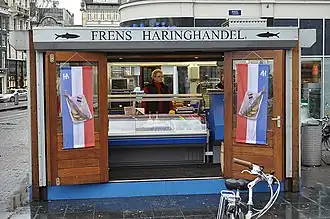 A typical Dutch delicacy is Hollandse Nieuwe (Dutch New), which is raw herring from the catches around the end of spring and the beginning of summer. This is typically eaten with raw onion. Hollandse nieuwe is only available in spring when the first seasonal catch of herring is brought in. This is celebrated in festivals such as the Vlaardingen Herring Festival and Vlaggetjesdag in Scheveningen. The new herring are frozen and enzyme-preserved for the remainder of the year. The herring is said to be eaten "raw" because it has not been cooked, although it has been subjected to a degree of curing. The first barrel of Hollandse Nieuwe is traditionally sold at auction for charity. Very young herring are called whitebait and are eaten whole as a delicacy.