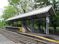The Needham cutoff opened on November 4, 1906, from West Roxbury to Needham Junction, allowing trains from the former New York and New England Railroad to reach Boston without needing to use the New York Central's Highland branch.[1] Building the cutoff required a significant length of difficult rock cuts - "one of the heaviest pieces of short railroad construction ever attempted in New England" - reaching a depth of 57 feet (17 m) at Great Plain Avenue.[4] Needham Junction was originally the only stop on the cutoff; Bird's Hill opened as an infill station at Great Plains Avenue in 1917.[1][5]