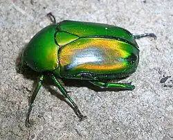 Heterorhina elegans is a species of Scarab beetle found in India and Sri Lanka that belongs to the flower chafer subfamily. Its genus name is frequently misspelled as "Heterorrhina".[2] The adults are about 2 to 3 cm long and are usually bright glassy green appearing reddish at some angles. The clypeus is narrow and there is a ridge along the middle. They are seen in aggregations made up of large numbers in southern India during June to October.