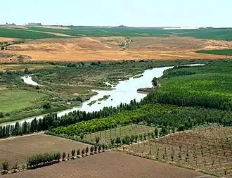 The Hevsel Gardens were created between the city and the river, with the objective of providing water and food for the inhabitants. Numerous springs emerge from beneath the basalt and the gardens are divided into five terraces above the present Tigris floodplain.[3] The terraces have been formed over millennia as the river meandered in its wide valley and sometimes carved itself a deeper channel. The uppermost part of the garden will have been critical to the siting of the city; the gardens were regarded as sacred because of their important provisioning role, and have been compared to the Garden of Eden.[4]