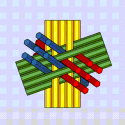 The hexastix arrangement has found use in mathematics, crystallography, reticular chemistry, puzzle design, and art. Michael O'Keeffe and associates define this structure as one of the 6 possible invariant cubic rod packing arrangements.[2] O'Keefe classifies this arrangement as the Γ or Garnet rod packing,[3] and describes it as the densest possible cubic rod packing. Rod packings are used to classify chains of atoms in crystal structures, and in the develop of materials like metal–organic frameworks.[4] It has been proposed that stratum corneum's structure could be modeled using the hexastix cylinder packing geometry.[5] Hexastix geometry has also found use in architecture, being used to construct a 3-story bamboo structure[6] in Ecuador. In recreational mathematics the hexastix arrangement can be found in the design of mechanical burr puzzles. [7] Stewart Coffin has used this geometry in the creation of complex non-rectilinear wooden puzzles. In art, hexastix is used by artist Anduriel Widmark[8] to create complex glass knots.[9][10] Hexastix is also seen in the sculpture titled "72 Pencils",[11] made by math artist George W. Hart.