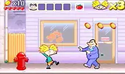 Just like the film's plot, Arnold and Gerald must save their neighborhood from an industrialist named Scheck, who wishes to demolish the area and build a mall in its place. The game consists of five worlds,[2] each one containing four levels and one boss enemy. The player may control Arnold, Gerald, Grandpa, and Grandma,[2] which all are assigned their own levels with their own objectives. The player may use weapons such as teeth and toilet paper to defeat enemies.[3] Helga, who can be unlocked with a secret code, replaces all the other characters. Using the same code will revert them.
