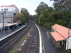 Heyington railway station was opened on 24 March 1890 with the line through the station originally built to link Burnley to the Outer Circle line at Waverley Road, before continuing onto Oakleigh. The station was named after nearby Heyington Place, which provides access to the station. The line underwent numerous extensions over its life, with extensions to East Malvern in 1929 and to Glen Waverley in 1930. In 1926, duplication of the line between Heyington and Burnley stations occurred, with duplication between Heyington and Kooyong stations occurring in 1955.[10] Duplication of the line to Darling occurred in 1956, with the line fully duplicated to Glen Waverley by 1964. In 1969, the current overpass, located just beyond the up end of the station, was provided.[10]