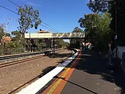 The station building, concourse, and platform are largely the same as when the station was rebuilt in 1975. There is no bike or car parking are available at the station.[5] The station is the only one in Melbourne accessed solely by stairs, with both platforms requiring stair access from the pedestrian footbridge.[9]