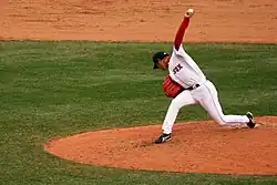 Okajima allowed a home run to John Buck on his very first pitch in the major leagues.[7] It was the eleventh time in MLB history a pitcher gave up a home run on his first pitch.[8] However, Okajima then proceeded to hold opponents scoreless for nearly two months until the Yankees scored a run off of him via a fielder's choice on May 22.[9] At the start of the 2007 Red Sox season, injuries and poor performances limited the effectiveness of anticipated setup relievers Mike Timlin and Joel Piñeiro. Okajima stepped into the role of primary setup man for closer Jonathan Papelbon and quickly became one of the most dominant relievers in the major leagues. Through the first two months of the season, Okajima cemented himself as the top setup man in the Red Sox bullpen garnering the American League Rookie of the Month for April.[10] Okajima's scoreless streak from April to May 2007 was the longest by a Red Sox left-hander since Bruce Hurst 20 years prior.[9]