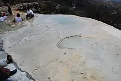 The more easily accessible and more often visited of the two waterfalls is the "cascada chica," also called the Amphitheatre.[2][4] This cliff rises over fifty metres above the valley floor, where there is a natural platform about sixty meters wide.[4] This platform has four springs. The water from three of the four springs is captured by a number of small natural pools and two large artificial pools in which visitors can swim. The lower of the two pools is very close to the cliff edge and was built in 2007.[3] In these pools, the water appears a turquoise green due to the mineral concentration.[3][2] The fourth spring is located closest to the edge and responsible for most of the waterfall rock formation.[3][2] Two of the four springs on the Amphitheatre side rise from the level floor and appear to bubble up, which is the source of the name.[5] The bubbling action of these and some other springs is thought to occur due to construction of underground water currents.[4] This bubbling action leads to the name of the area, Hierve el Agua (the water boils). Water constantly flows out of the springs and the process of depositing the calcium carbonate is ongoing, which can be seen on the walls of the artificial pools.[2]