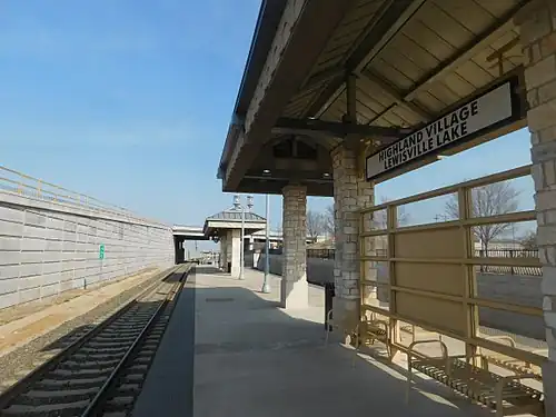 ![]() The Highland Lake/Lewisville Village station in February 2017. A milepost sign for Interstate 35E is present on the left. | |||||||||||