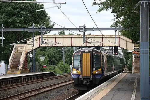 The basic off peak frequency from here (Monday to Sataturday) is half-hourly, eastbound to Glasgow Central and westbound to Greenock Central and Gourock. A few Wemyss Bay trains call in the peaks and also in the evenings (once per hour each way after 18:30, as the Gourock service drops to hourly). On Sundays both Gourock and Wemyss Bay trains call here, giving a half-hourly frequency to/from Glasgow.[3]