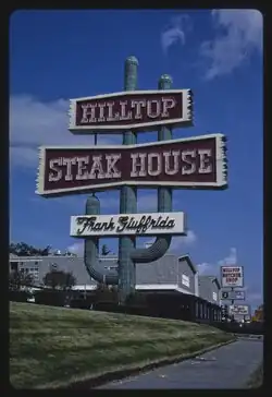 In 1961, Giuffrida, a 43 year old butcher from Lawrence, Massachusetts, purchased a small bar on busy Route 1 in Saugus for $7,000 and converted it into a 125-seat steakhouse. The restaurant soon drew large crowds, which required an expansion to 400 seats. A third expansion later brought the restaurant's capacity up to 1,500 seats. Giuffrida also added a butcher shop to the rear of the restaurant.[1] The Hilltop was known for its decorations outside including a 68-foot-high neon cactus and full-sized plastic cows. The Boston Globe’s Anthony Spinazzola described the Hilltop's interior decor as "old ranch modern with wooden Indians, stone fireplaces, buffalo heads, Victorian lighting fixtures, plastic flowers and color that runs to expected browns and reds".[2] The restaurant featured five dining rooms and a cocktail lounge named after Wild West cities (Dodge City, Kansas City, Sioux City, Carson City, Santa Fe, and Virginia City).[3] Until the 1990s the restaurant did not take reservations or accept credit cards.[4]