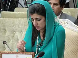 Hina Rabbani Khar[a] (born 19 November 1977)[3] is a Pakistani politician who served as Minister of State for Foreign Affairs from 19 April 2022 to 10 August 2023. She previously served as Foreign Minister of Pakistan from July 2011, the first woman to hold the position,[4] and was a member of the National Assembly from August 2018 to August 2023.