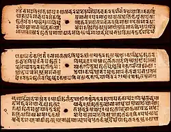 The 6th-century Brihat samhita is a Sanskrit encyclopedia. Its chapters 57–60 discuss different styles and design of Hindu temples. Above: the text and commentary in Nepalaksara, Devanagari and Tamil Grantha scripts.