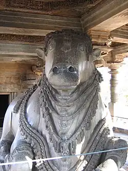 Th reign of the Hoysala Empire occurred between the 10th and 14th centuries over the western region of Karnataka. Many temples were built with chlorite stones or soapstones and the architecture which evolved was called the Hoysala architecture, known for architectural detailing. The unique features of this style comprise a central hall linked to three star shaped shrines, and the temple towers are laid in horizontal tiers.[22] Dorasamudra, known as Halebeedu, was the dynastic capital. Hoysaleswara Temple is dedicated to the Hindu god Shiva as the family deity of the Hoysalas.[23] Bittiga, the ruler of the Hoysala empire, converted from Jainism to Hinduism. He was given the name Vishnuvardhana by Ramanuja, one of the three eminent social reformers and religious heads of Hinduism who consecrated the Hoysaleswara Temple built in 1121. Dedicated to Shiva, it has two sanctum sanctorums and the deities are in the form of lingas named Hoysaleshvara and Shantaleshvara, after the king and queen. Built over a period of 70 years, it was left incomplete. It has an enormous Nandi, the mount of Shiva. There is a small Surya (Sun god) temple behind the sanctorum deified with a Surya (Sun) image which is 2 metres (6 ft 7 in) in height. The walls of the temple have been carved with scenes of Ramayana, Mahabharata and the Bhagavad Gita epics; they are crafted on the external and internal walls, with Yabancharya named as the architect. The town was ravaged by Muslim invaders in 1327.[24]