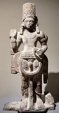 The human-sized sculpture of the second phase Vishnu with Pallava influence was discovered in Sri Mahosot in Central Thailand. Vishnu is attired in a plain cylindrical crown along with a transparent lower garment. The style of the sculpture shares a similarity with the ones discovered in Southern Thailand.[13][14]