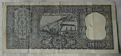 A commemorative stamp on Hirakud Dam was released on 29 Oct 1979 by the Department of Posts, with denomination 30 paise (0.35¢ US), 3,000,000 stamps issued.[17] A hundred rupee note was issued on 26 December 1960 by RBI Governor H.V.R. Iyengar. The size of this note is 109 mm × 172 mm (4.3 in × 6.8 in). On the back side of this note there are thirteen regional languages along with an image of the Hirakud Dam and Hydro-Electric station.