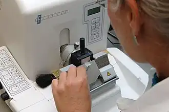 Ultramicrotomy is a method of preparing extremely thin sections for transmission electron microscope (TEM) analysis. Tissues are commonly embedded in epoxy or other plastic resin.[9] Very thin sections (less than 0.1 micrometer in thickness) are cut using diamond or glass knives on an ultramicrotome.[12]